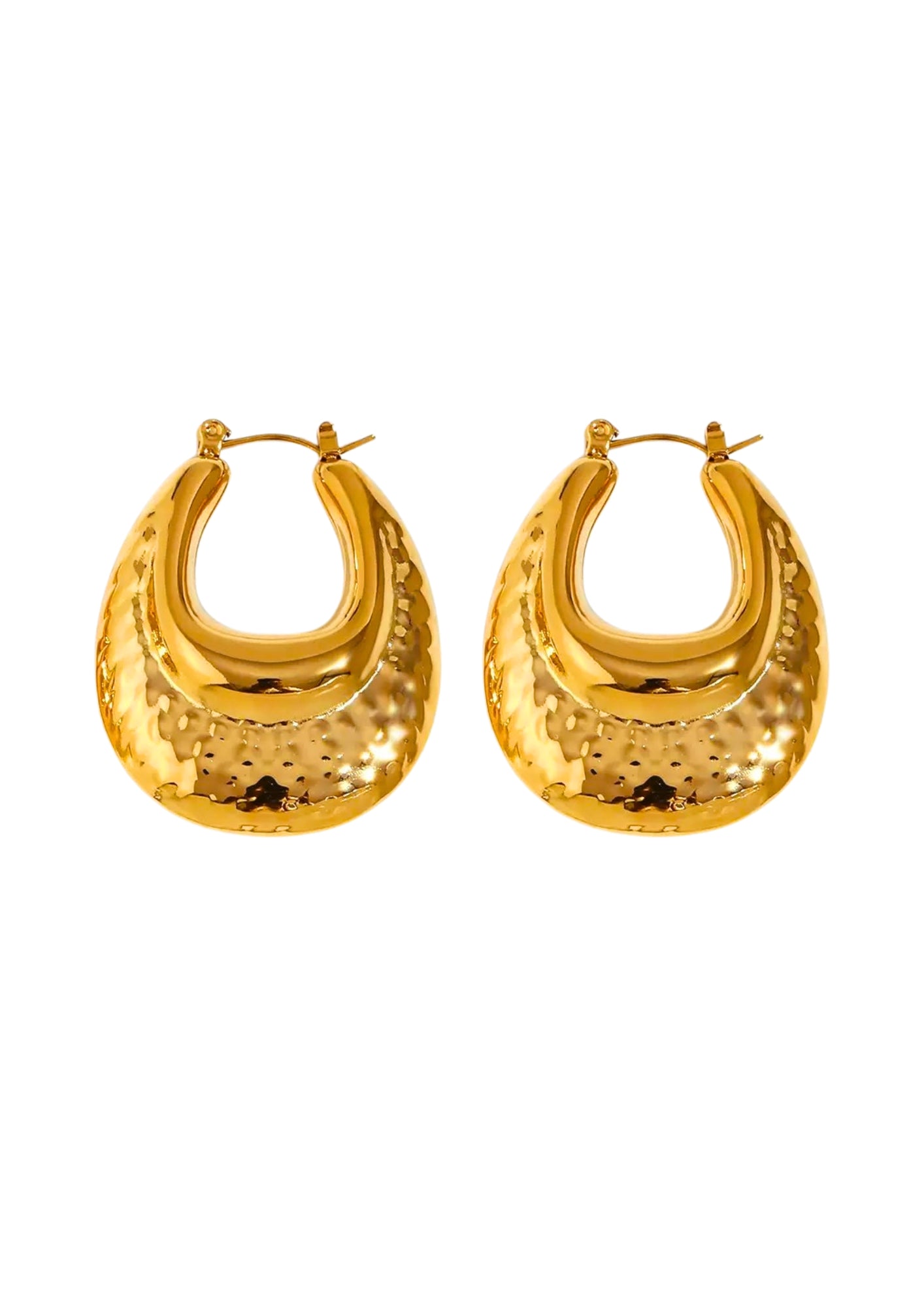 The Emma Gold Hoop Earrings showcase a bold U-shaped design with a hollow hammered texture. Available in both gold and silver, these earrings make a striking statement with their modern and unique appeal.