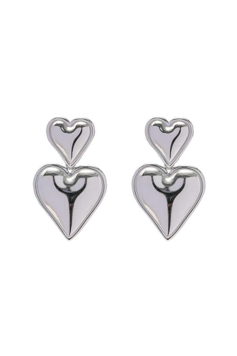 The Jayda Heart Silver Earrings feature a bold double heart drop design, adding a playful yet striking touch to any outfit. Also available in gold, these earrings are perfect for making a statement, whether worn alone or paired with other pieces.