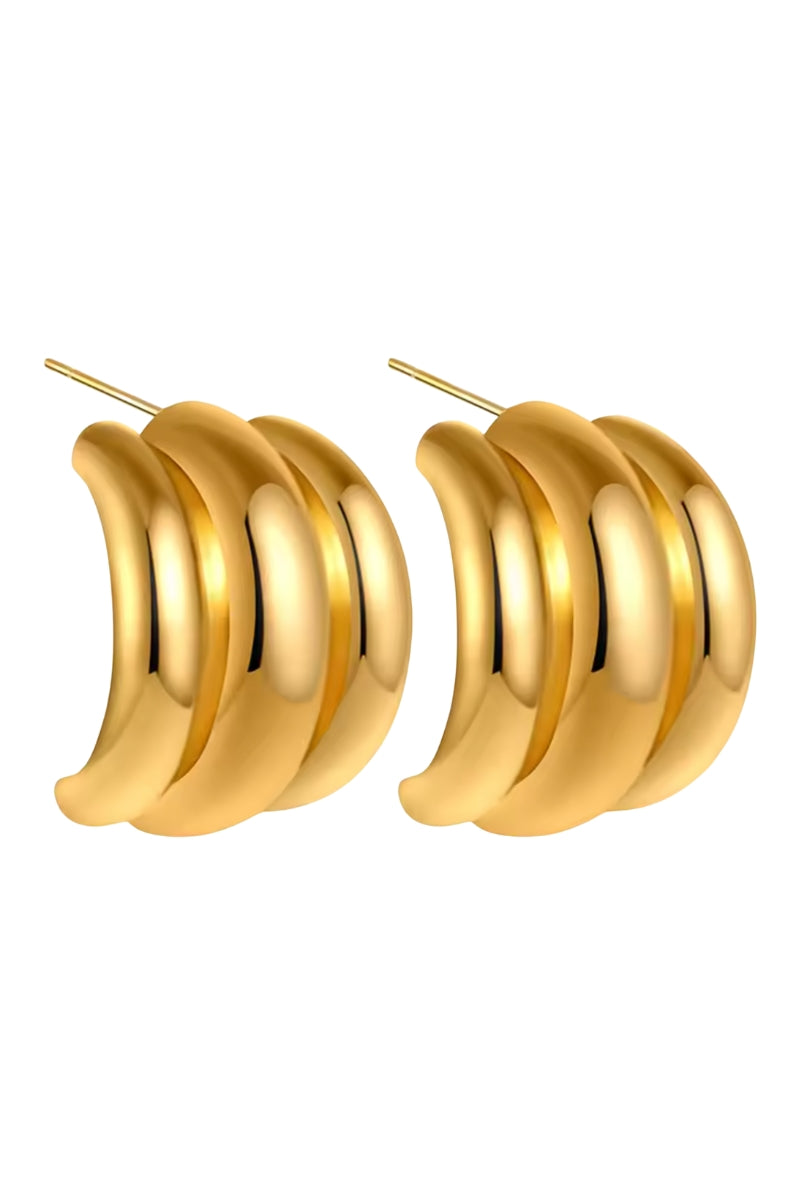 Open hoop earrings with elongated ridged detailing for a sculptural look. The Kate Gold Earrings feature a stud closure and can be worn alone or layered. Available in gold and silver.