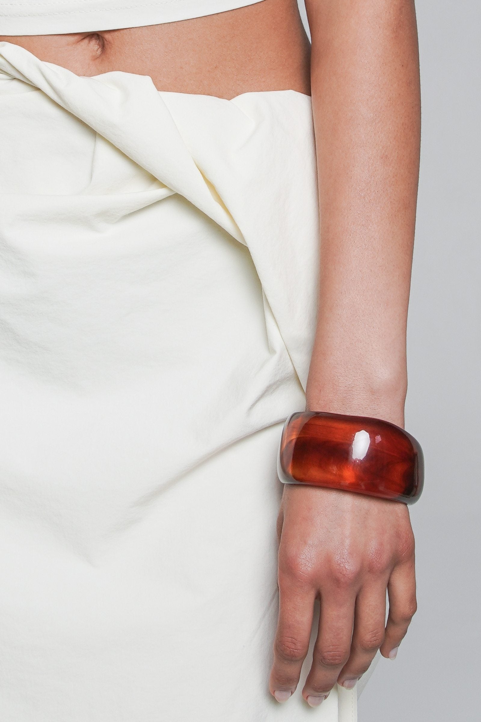 The Amber Stackable Bangle features a rich, amber-toned resin in a wider style. Ideal for making a statement while layering or worn solo for a simple yet striking finish.
