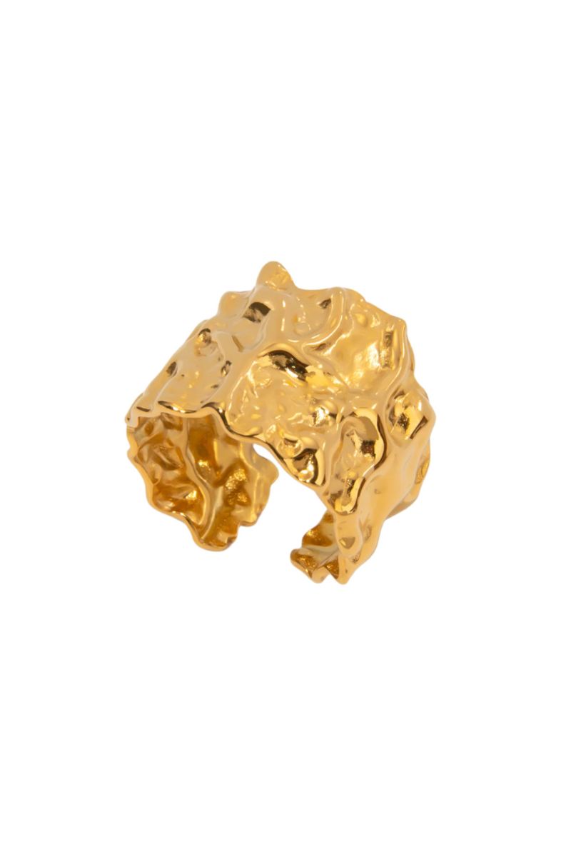 The Lola Gold Ring combines a wide, open design with a hammered metal texture, offering a striking balance of simplicity and statement. Wear it solo or stack it for more impact.